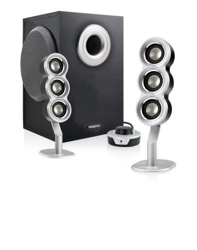 Creative's I-Trigue 3330 speaker system is the choice for people who demand great desktop audio with extra style. The impressive design of the tall, slim satellites features three silver drivers which contrast dramatically with the glossy enclosures which look brilliant alongside notebook PCs, flat panel monitors and other advanced systems. Creative uses NeoTitanium micro drivers which deliver much better audio than ordinary aluminum drivers, combining a more realistic presence with crisp detail and strong penetration. A powerful subwoofer with flared port tube combines clarity and detail with clean, strong bass, while the wired remote makes the I-Trigue 3330 easy to manage.View detail at Amazon.